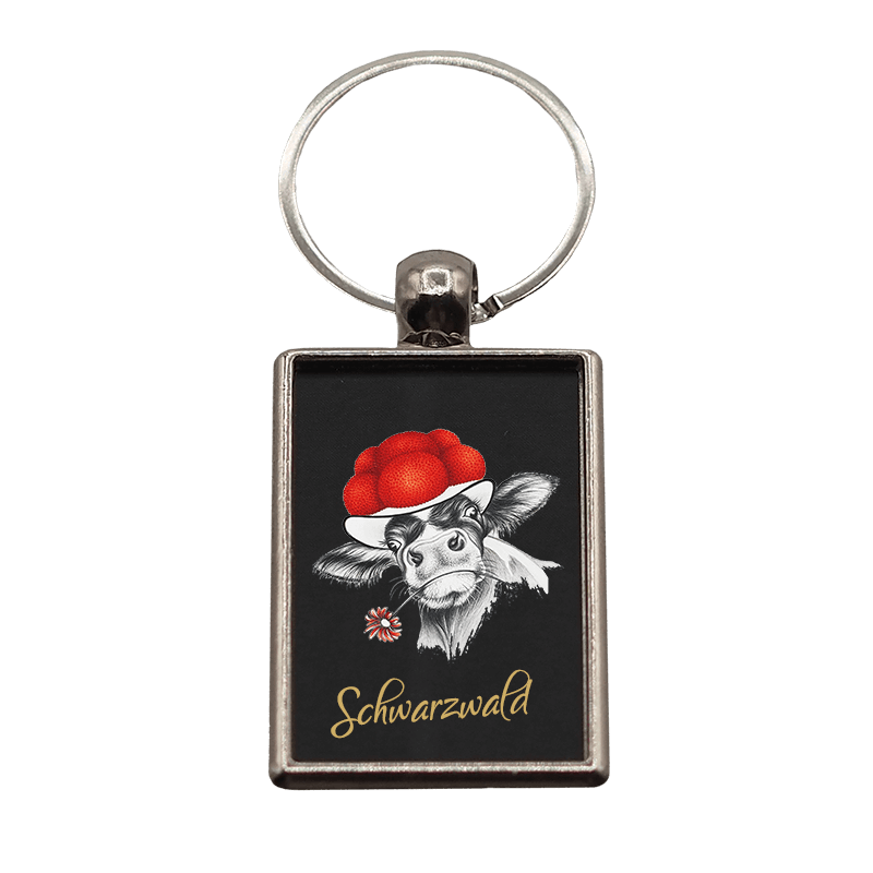 Schlüsselanhänger Bollenhut Kuh mit Blume, rechteckig, 40x25mm